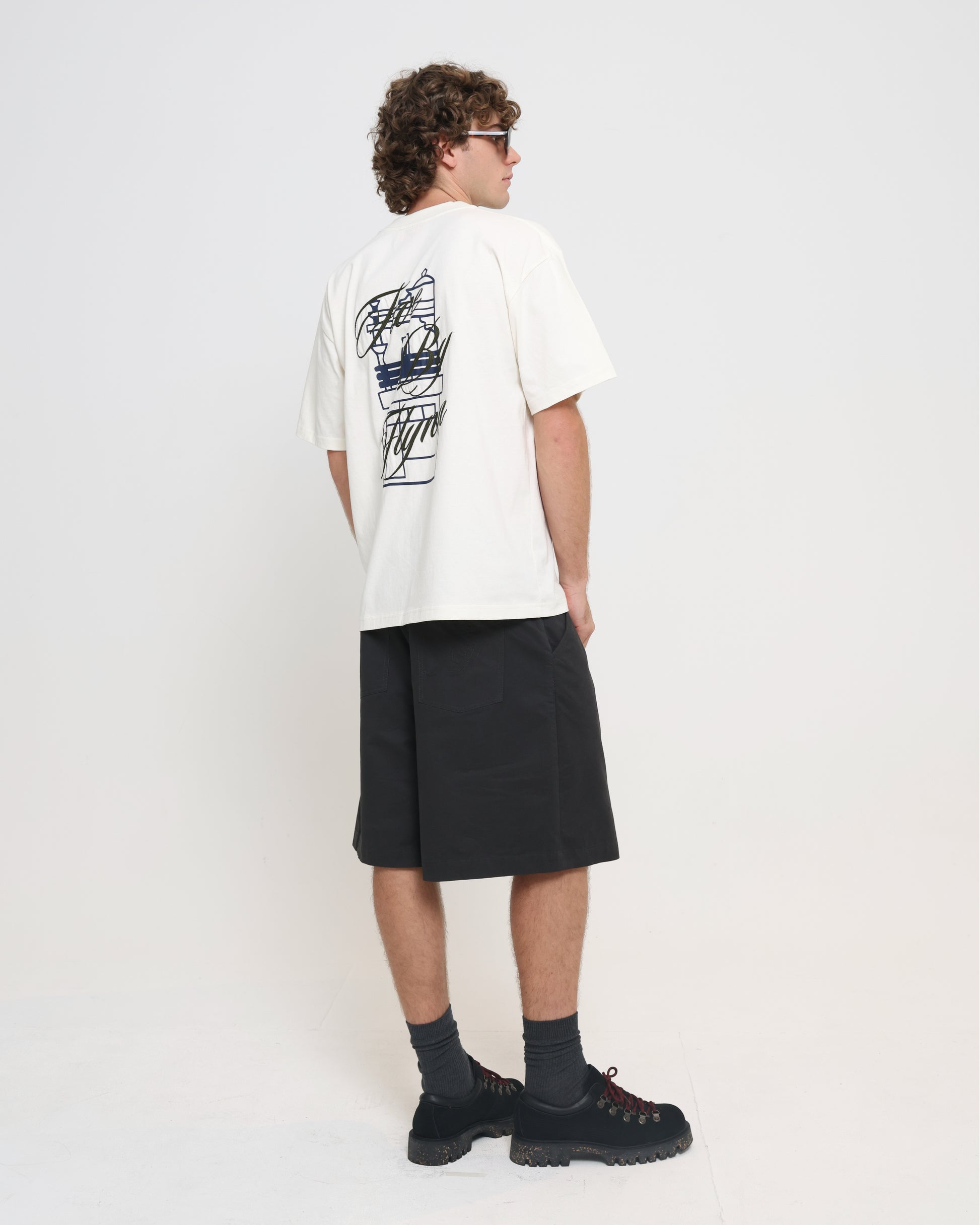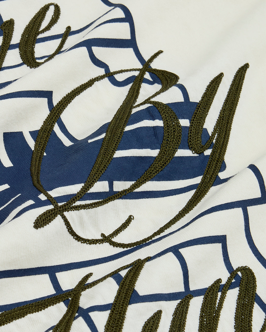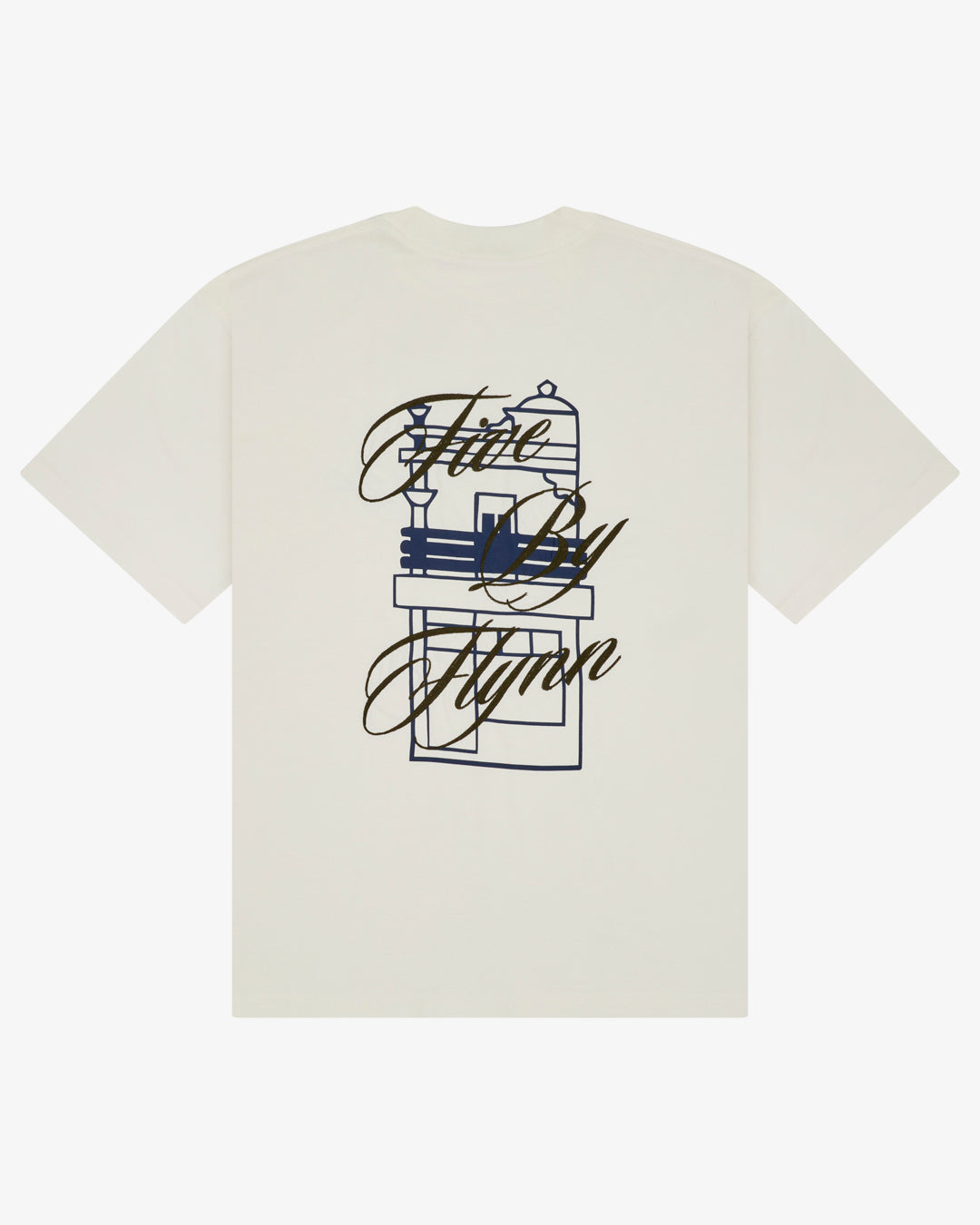 The Storefront Tee features a custom illustrated shopfront graphic layered with contrast embroidery.